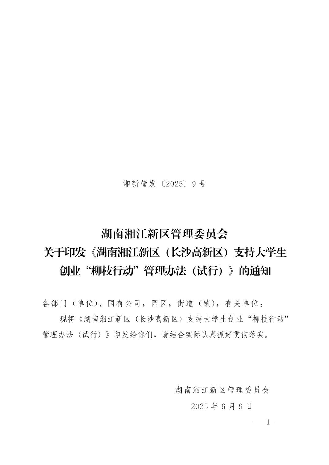 湖南湘江新區(qū)管理委員會(huì)關(guān)于印發(fā)《湖南湘江新區(qū)(長(zhǎng)沙高新區(qū))支持大學(xué)生創(chuàng)業(yè)“柳枝行動(dòng)”管理辦法(試行)》的通知