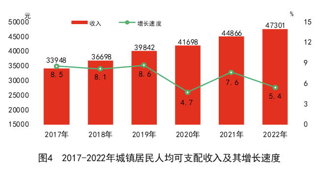 全年全省居民人均可支配收入34036元,比上年增長6.4%;全省居民人均可支配收入中位數27400元,增長6.1%。按常住地分,城鎮居民人均可支配收入47301元,增長5.4%;城鎮居民人均可支配收入中位數42432元,增長5.6%。農村居民人均可支配收入19546元,增長6.8%;農村居民人均可支配收入中位數17583元,增長6.6%。城鄉居民收入比由上年的2.45縮小為2.42。分區域看,長株潭地區全體居民人均可支配收入51802元,增長5.9%;湘南地區全體居民人均可支配收入31500元,增長6.6%;大湘西地區全體居民人均可支配收入23611元,增長6.4%;洞庭湖地區全體居民人均可支配收入31070元,增長6.5%。脫貧縣[16]農村居民人均可支配收入14714元,增長8.7%。
